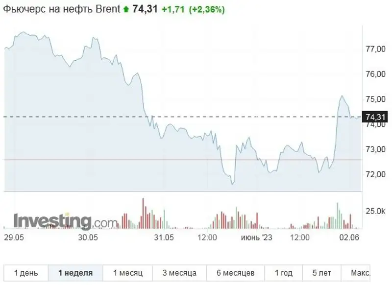 Цены на нефть марки Brent колебались на этой неделе в достаточно широком диапазоне. В понедельник, 29 мая, стоимость барреля составляла 77,07 доллара, снизившись во вторник до 73,54 доллара. В среду цена просела уже до 72,14 доллара, временами доходя до 71,53. В четверг стоимость бочки «черного золота» отыграла до 74,31 доллара.