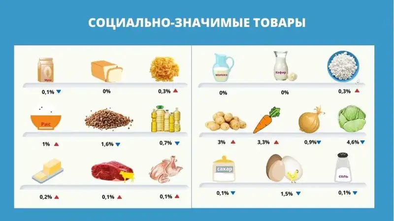 Согласно инфографике, которую опубликовало статистическое ведомство, в Казахстане подорожали такие продукты, как морковь (+3,3%), картофель (+3%), рис (+1%), макароны-рожки (+0,3%), творог (+0,3%). Незначительно увеличились цены на курятину и говядину.